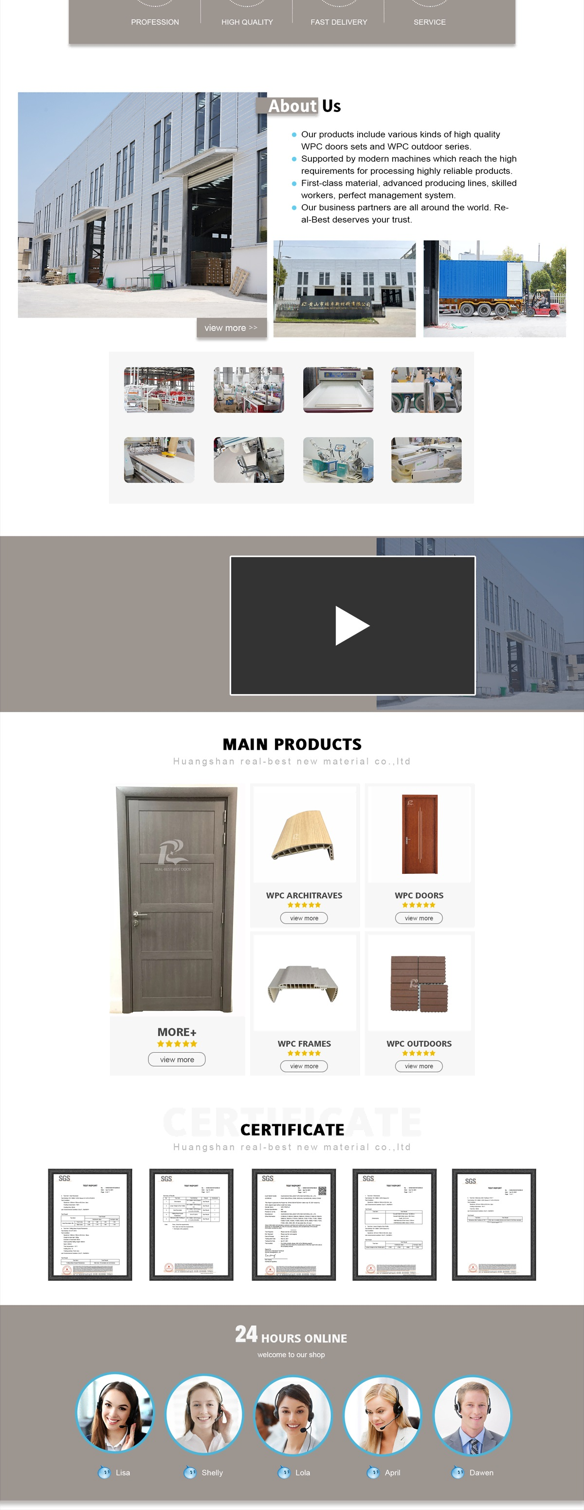 Huangshan Real-Best New Material Co.,Ltd is located in the world-famous Huangshan City. Closed to the world business center Hangzhou and Shanghai. With a weather of experience, we Real Best New Material are well-known as a professional supplier and trader of WPC in Anhui China. Our products include WPC doors, WPC frames, WPC architraves and other WPC indoor and outdoor products.